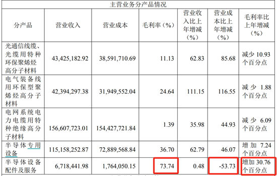 至正股份功绩情况比较至正股份传统业务和新拓展的半导体业务不错发现,半导体业务的营收、利润增速均远高于传统业务。字据公司2024年财报,线缆用高分子材料业务各产物类型商业成本增长幅度大于商业收入,毛利率出现不同进度的着落。而半导体专用开荒业务方面,半导体配件及职业商业收入增长73.74%,商业成本裁汰53.73%,毛利率高涨30.76个百分点。