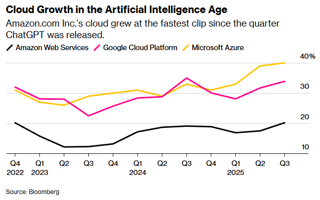 亚马逊AWS在第三季度的强盛说明拆除了投资者对这家群众最大云算计工作提供者正被竞争敌手奋发自强的担忧,。在第二季度,微软(MSFT.US)的Azure云业务增长速率委果是AWS的两倍,而Alphabet(GOOGL.US)旗下谷歌云(Google Cloud)增长了33.5%。财报发布前,投资者对亚马逊云业务的预期相对较低,因为该公司最近几个季度曾提到新数据中心投产受限。首席本质官贾西(Andy Jassy)和其他高管曾默示,他们对云业务捏乐不雅倡导,但并未明确预测增长将再行加快。
