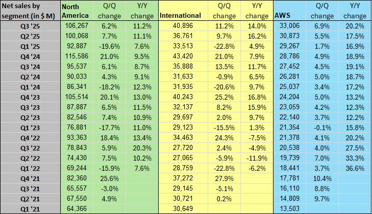 成绩于云业务的强盛说明,亚马逊(AMZN.US)2025年第三季度事迹超出市集预期。财报披露,亚马逊Q3净销售额同比增长13%至1802亿好意思元,好于分析师平均预期的1778亿好意思元。按部门永别,AWS(亚马逊云工作)部门销售额同比增长20%至330亿好意思元,创下2022年以来的最大增幅,同比增速及销售额分别高于分析师平均预期的18%及324亿好意思元。与此同期,北好意思业务销售额同比增长11%至1063亿好意思元,外洋业务销售额同比增长14%至409亿好意思元。