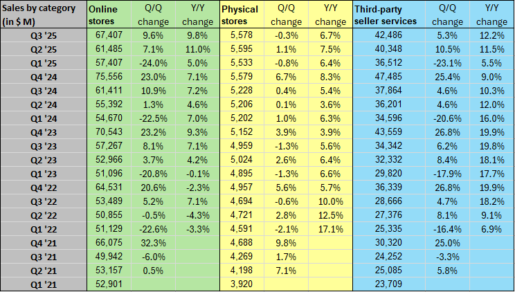 若按类别永别,在线商店收入同比增长10%,至674亿好意思元;第三方卖家工作收入同比增长12%,至425亿好意思元;告白工作收入同比增长24%,至177亿好意思元;实体商店收入同比增长7%,至56亿好意思元;订阅工作收入同比增长11%,至126亿好意思元。